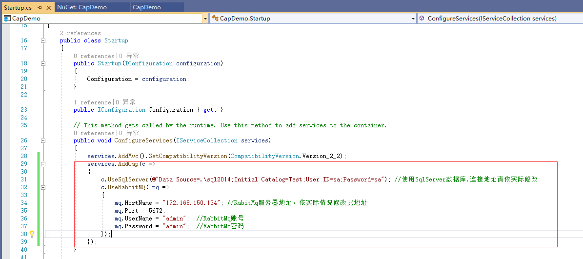 在Nuget中添加 DotNetCore.CAP DotNetCore.CAP.RabbitMQ DotNetCore.CAP.SqlServer 的引用。