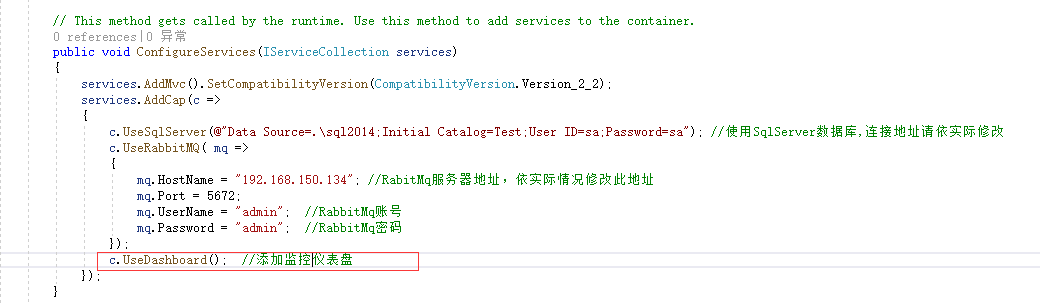 1:只需要在Startup.cs的AddCap方法中添加配置: c.UseDashboard(); 就万事大吉了,一个功能强大的事件管理界面就出来了,具体如下图: