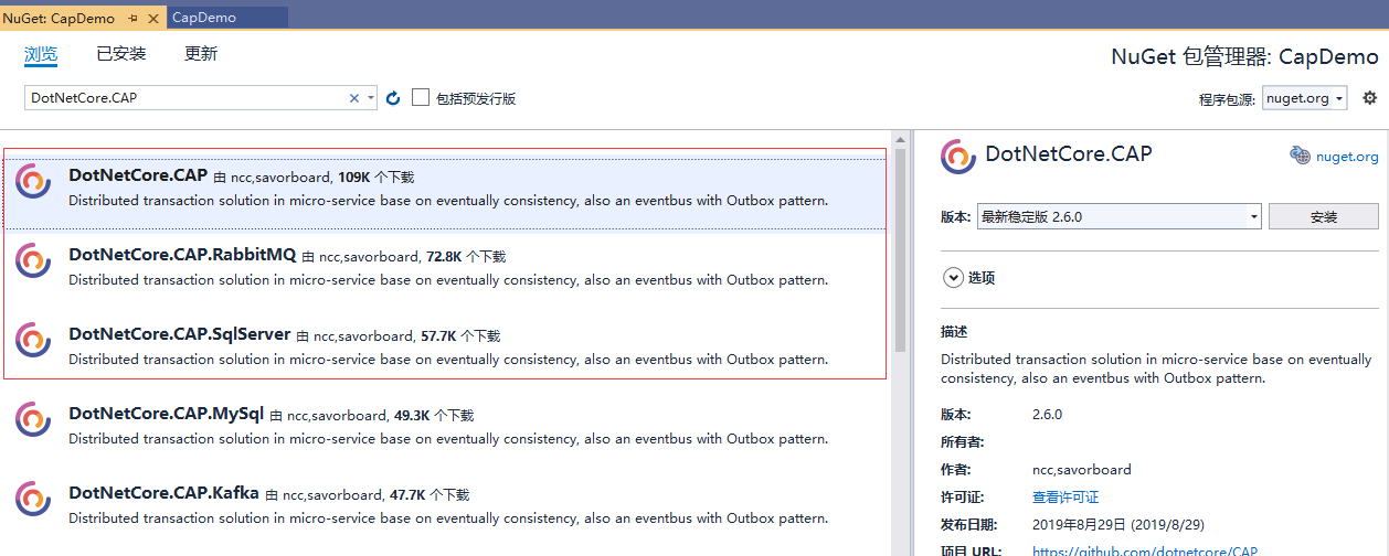 CAP2.6是2019-8-29发布的,目前官网上的文档快速开始已经无法使用,因为里面用了 Savorboard.CAP.InMemoryMessageQueue 组件,该组件还是2.51,不支持最新的CAP2.6版本,应该得过段时间才会修复文档,或者等 Savorboard.CAP.InMemoryMessageQueue组件更新。现在我们就在这开始我们的“快速开始”吧。我们将基于rabbitmq和sqlserver数据库来实现。