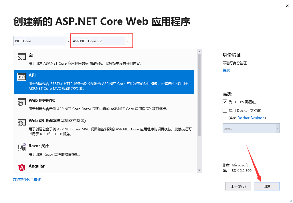 打开VS创建一个名叫CapDemo的webapi项目,版本选择ASP.NET Core 2.2。CAP2.6不支持2.2以下的.net core
