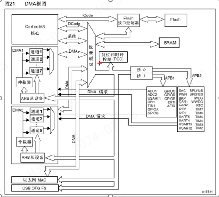 CPU对DMA进行相应的配置->硬件外设触发/软件触发->DMA读取寄存器数据并写入到另一个寄存器