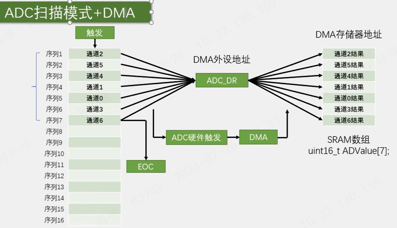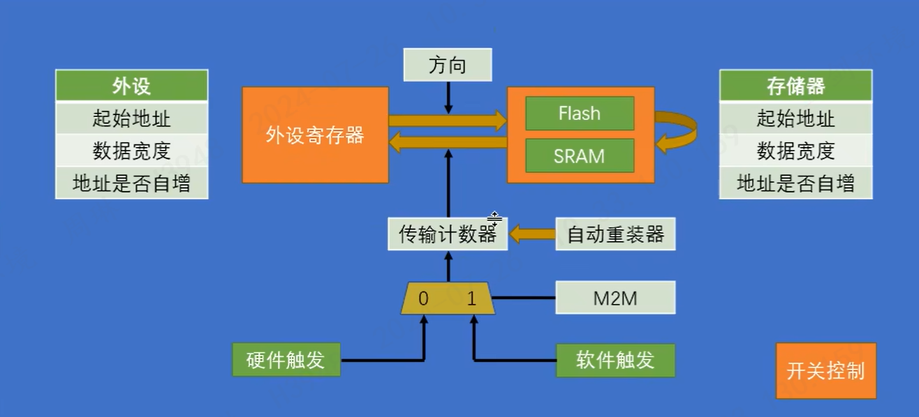 开关打开,触发,传输计数器不为0时,DMA会进行数据的转运,从一个寄存器转到另一个寄存器,直到传输计数器为0。其中自动重装器是为了循环使用,硬件触发一般适用于外设,软件触发适用于内部寄存器的转运。