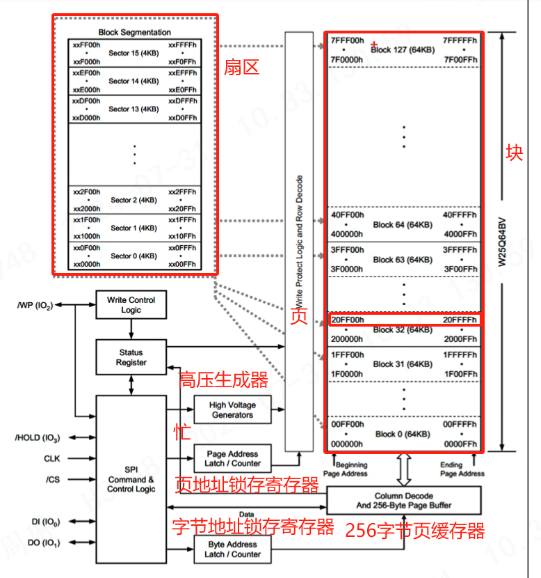 存储空间->块->扇区->页,每页256byte