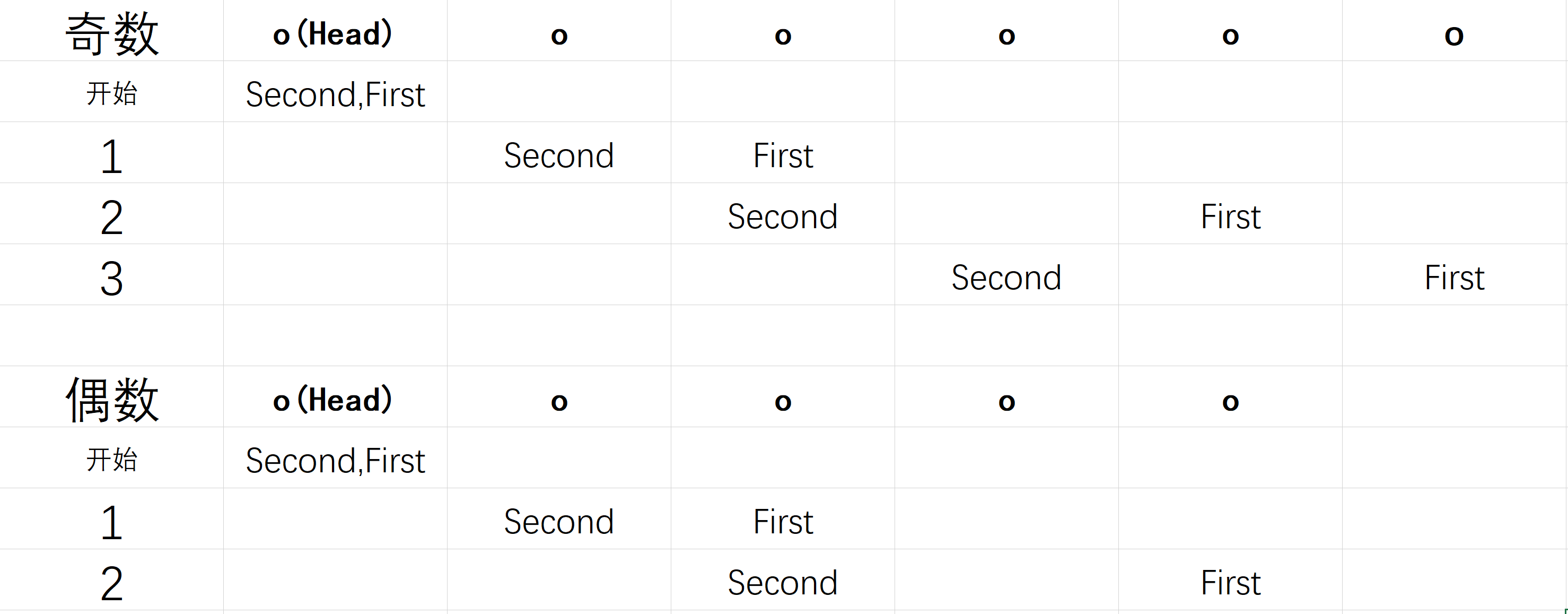 然后是判断单链表的元素个数是奇数还是偶数的问题,观察我下面画的表。当元素个数为奇数的时候,First停止时,Second位置正好就是中间的位置,问题是元素个数为偶数的时候,First停止时,中间有两个位置,我选择的返回的是第二个位置。