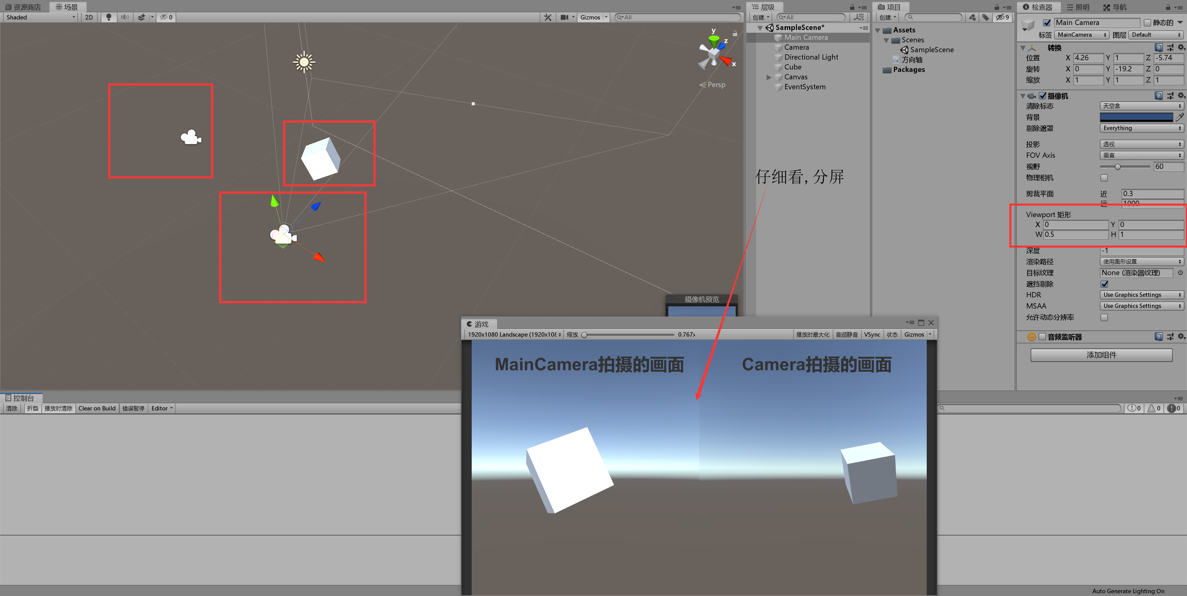 结合层级视图、Game窗口、Scnece视图以及相机的属性面板,就能发现这个视口坐标系是干什么的。
