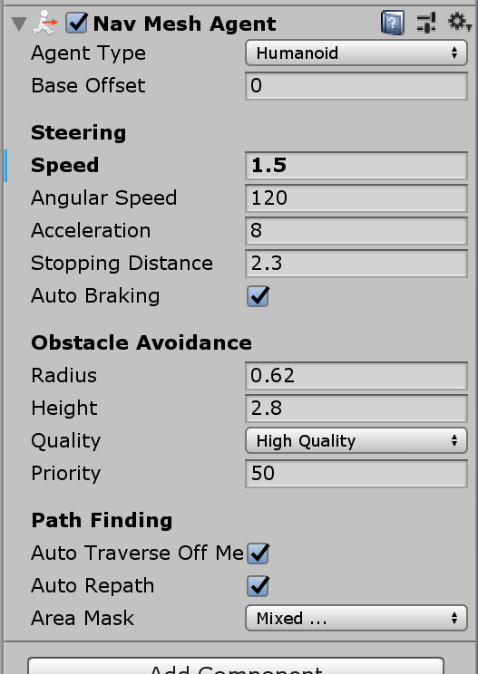 首先,需要用到Unity自带的NavMeshAgent组件,也就是自动寻路组件