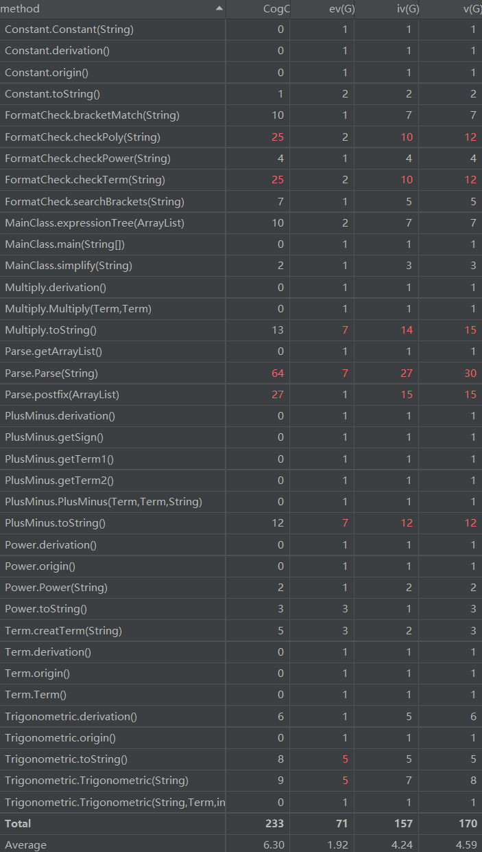 由图中可以看出,复杂度较高的为parse类中的parse方法和postfix方法,以及加减、乘法的toString方法,前者的转化必不可少的需要许多条件判断语句,我暂时没有想到很完美的解决办法,后者还是因为优化的过程中需要对0/1等特殊值进行特殊判断。