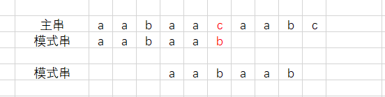 KMP的核心思想就是当模式串和主串对应的位置不匹配时,我们并不是只移动一个字符位,而是尽可能多的去移动模式串,就像下列例子b和c不相匹配时,我们直接后移了三个位置大小,直接让模式串的第三个字符与主串中不相匹配的那个字符接着比较。