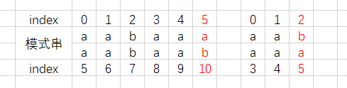 发现index=5和index=10虽然不匹配,但是index的前面子串的后缀index=3,4和index=0,1是匹配的,也就是说我们可以让index=10与index=2比较,发现相匹配,因此有了next[ 11 ]=2+1=3。简单地理解就是模式串[ 0~1 ]=模式串[ 3~4 ]=模式串[ 8~9 ]。当我们在匹配模式串时,寻到不相匹配的位置时,因为当前位置的前几位已经完成匹配,与匹配的前缀相符的,而前缀势必在之前作为后缀与更前的前缀匹配过,且完成匹配,我们可以让当前后缀去匹配更前的前缀,若是成功+1得出next的值,不成功就在往前寻早,直到寻到index=0为止。