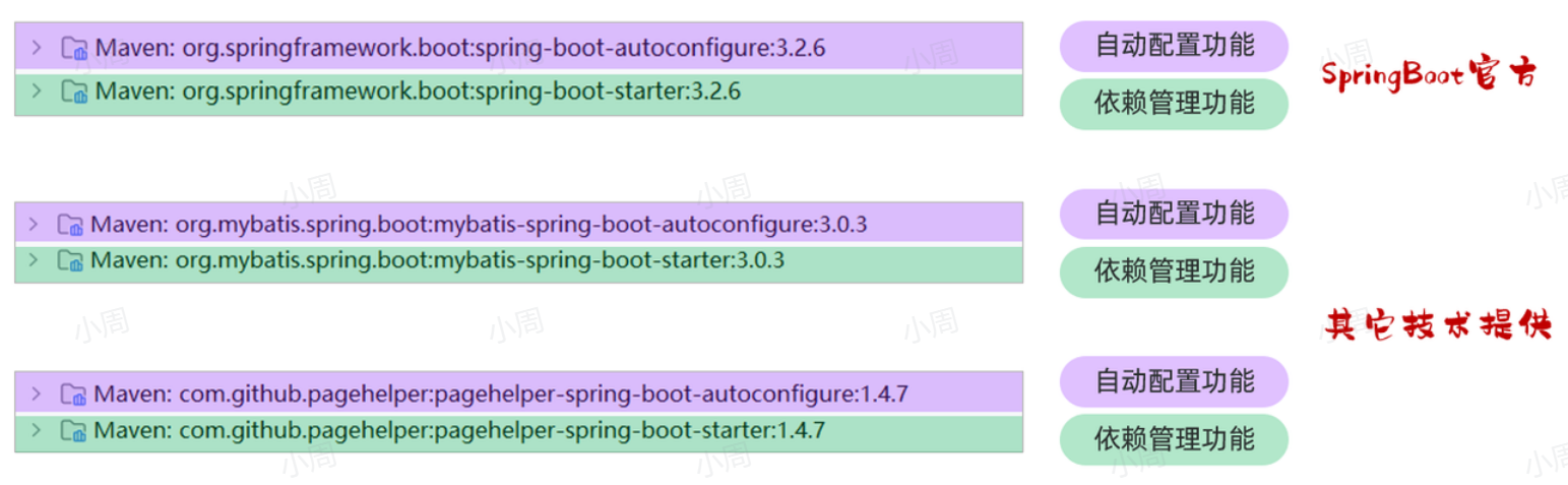 在 Springboot 中,官方提供的起步依赖 或 第三方提供的起步依赖,基本都会包含两个模块,如下所示: