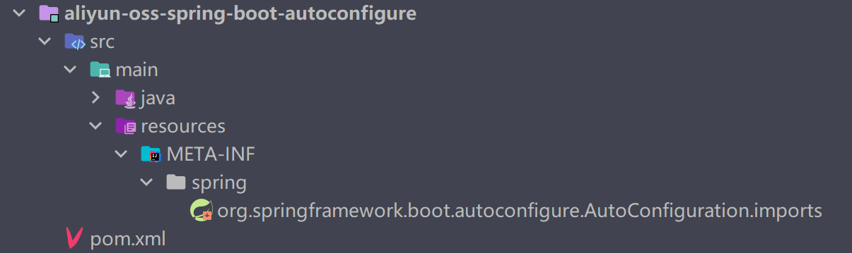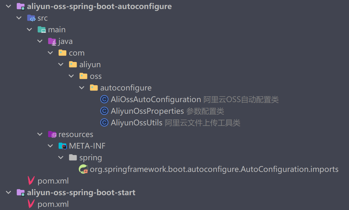 定义 aliyun-oss-spring-boot-start 模块,把阿里云 OSS 所有的依赖统一管理起来,创建完后的项目只需要保留 pom.xml 文件即可