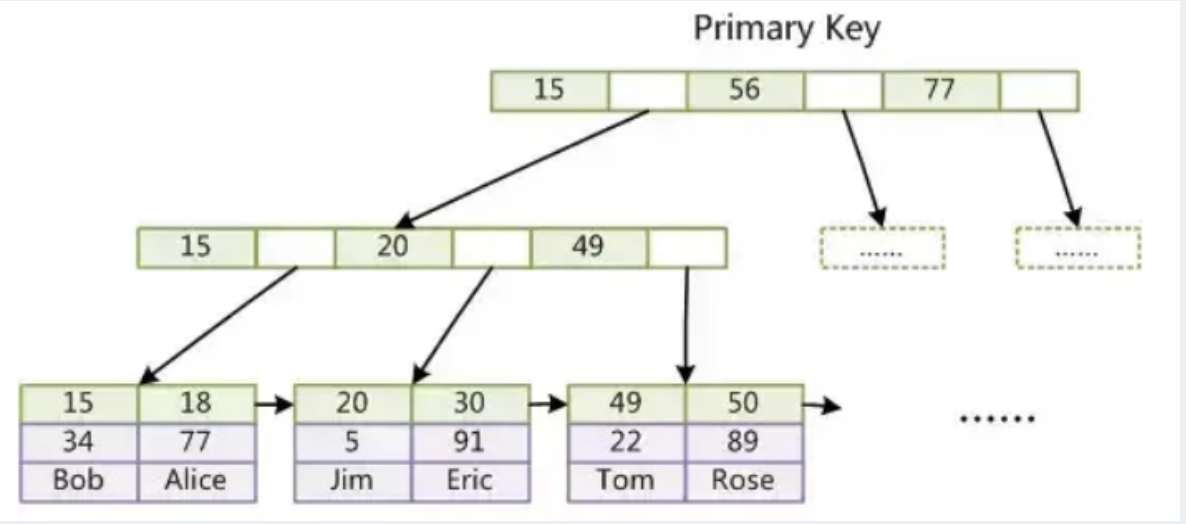 B 树存储的是索引值和行数据,所以会导致一个节点存储的数据有限,一个节点共有 16KB 左右,一行数据大概是 1KB,加上索引后导致一个节点只能存储大约 15 个数据,因此存储结构约为: