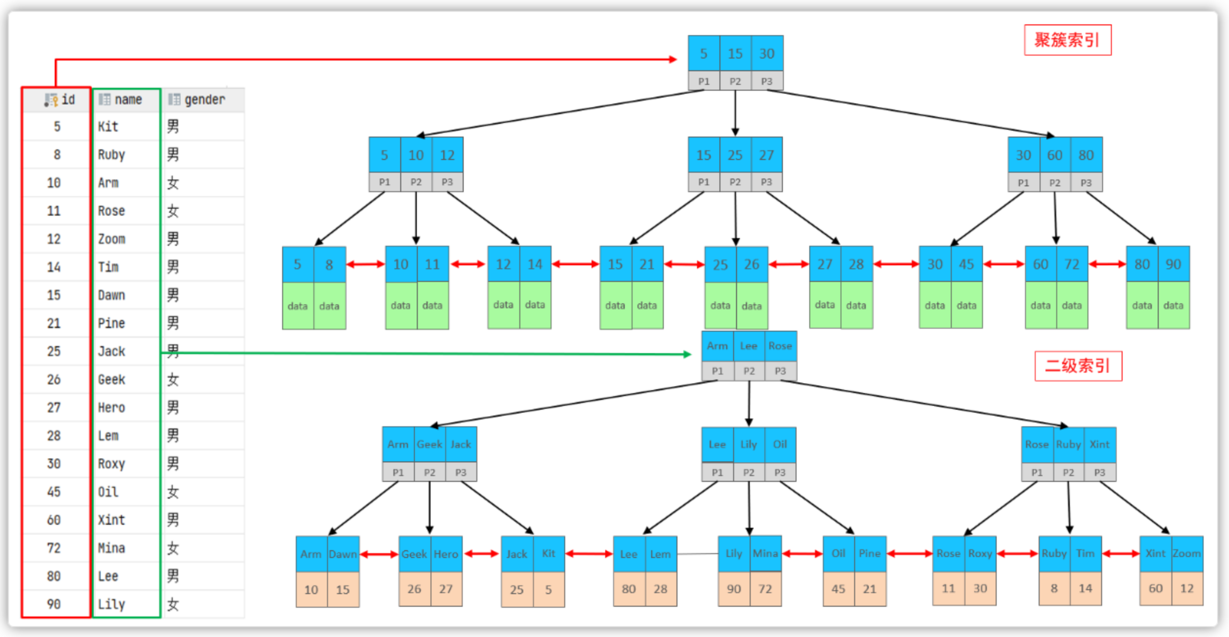 此外,在 B+树的叶子之间也使用了双向指针,提高区间查询的性能。