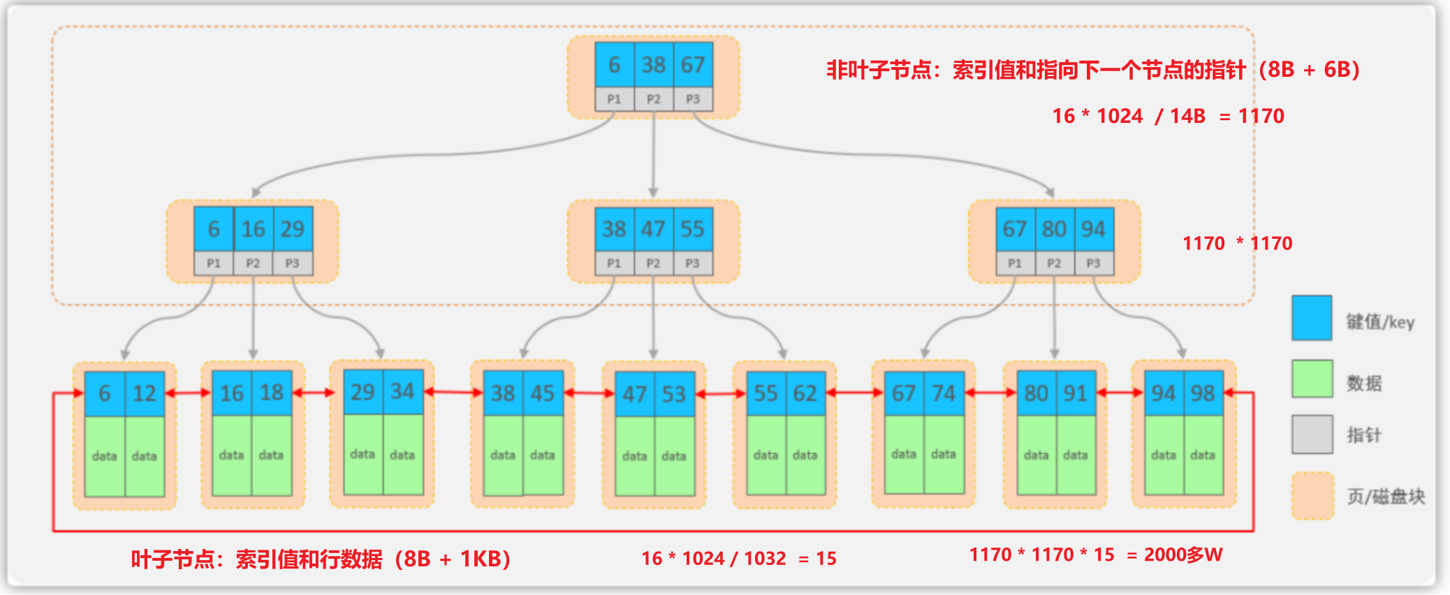 为了解决 B 树存在的问题,MySQL 底层在 B 树的基础上,引入的 B+Tree,而 B+ 树的非叶子节点存储的是 索引值 和 指向下个索引值 的指针,一个索引值大于占 8B,而指针占 6B,总共 14B,因此一个节点可以存储 1170(16 * 1024B / 14B = 1170)左右个数据,因此树形结构为: