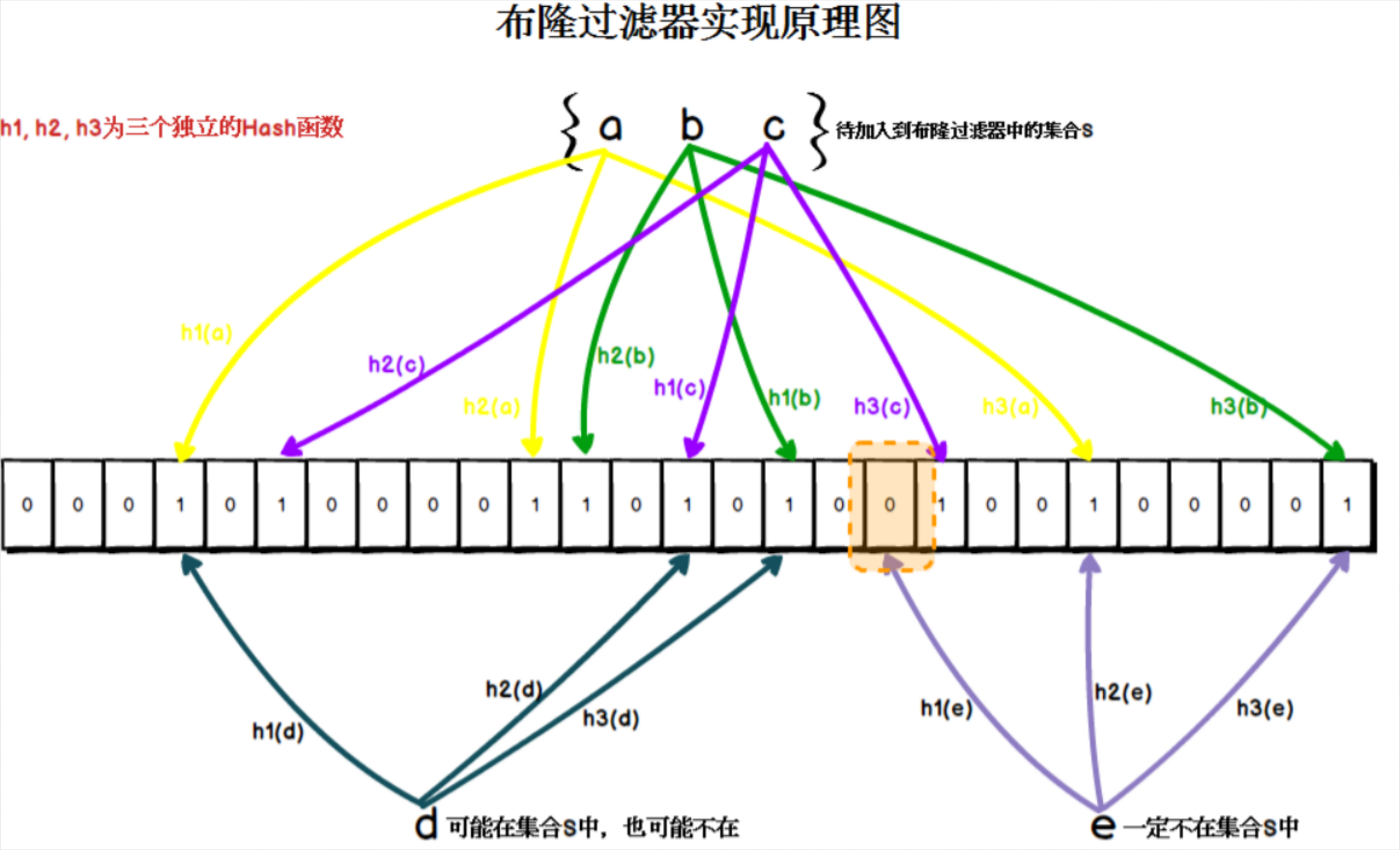 它使用多个 Hash 函数将一个元素映射成一个位阵列(Bit array)中的一个点,将 Bit array 理解为一个二进制数组,数组元素是 0 或 1。