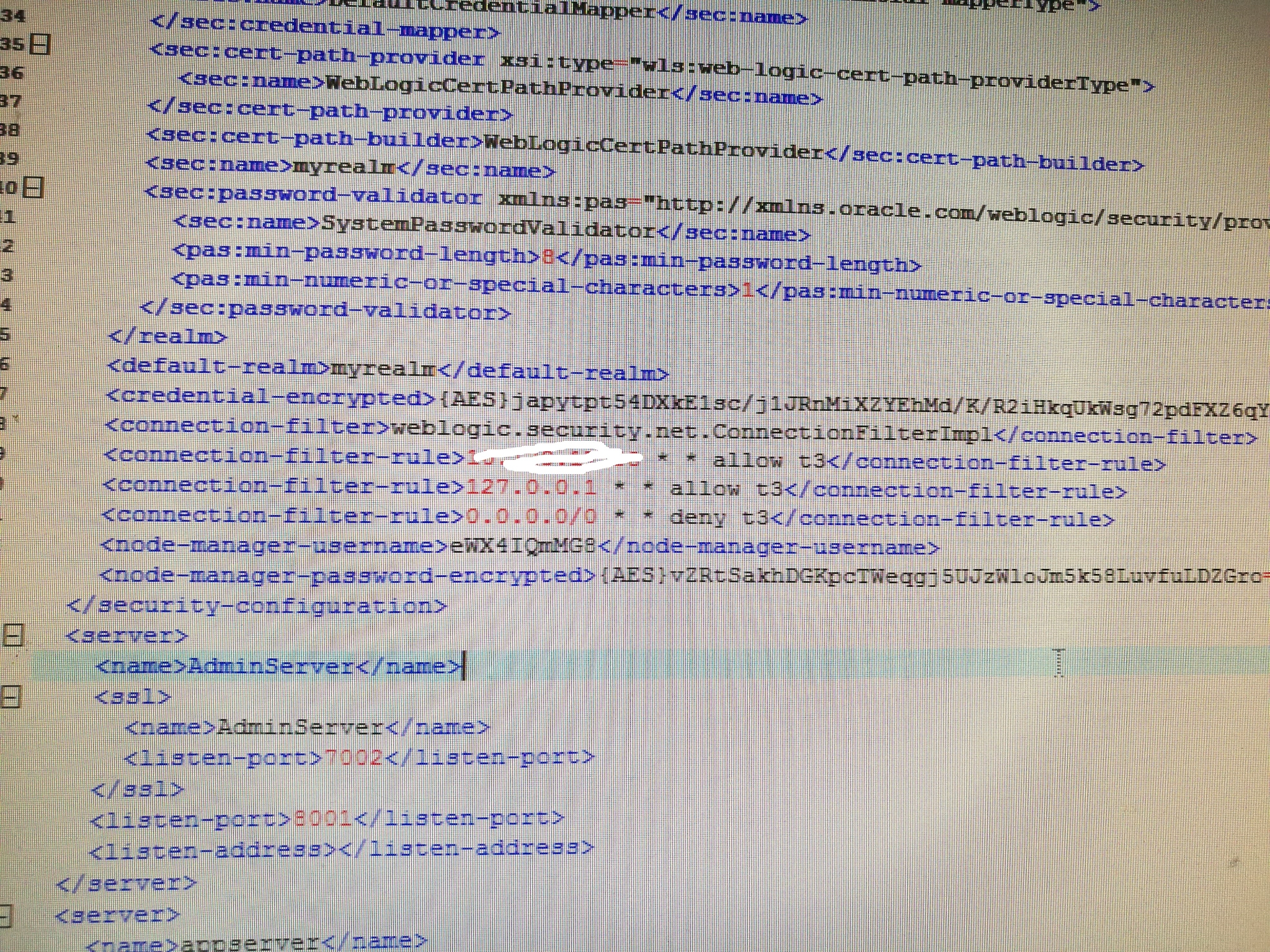 weblogic 12 漏洞修复需要添加t3连接筛选器时,由于IP地址后忘了加 * * (如:11.111.11.1 allow t3 ,应该是11.111.11.1 * * allow t3)。导致重启AdminServer后报过滤器异常weblogic.utils.NestedRuntimeException: [Security:090467]problem with connection filter并且服务启动失败。