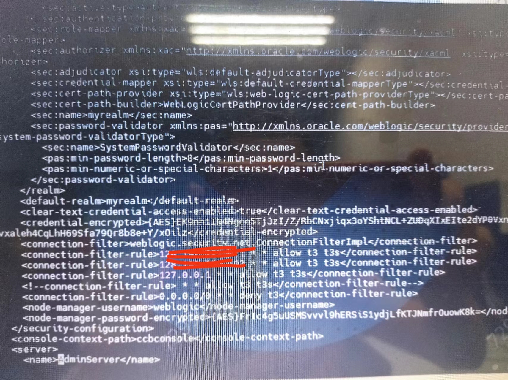 11g的情况一样,也是这样的报错,但是找不到文件:找到/weblogic/wls1212/user_projects/domains/brms_domain/config/config.xml,找到配置的过滤地址后直接修改配置,然后重启服务就好了。11g和12c的路径不一样。