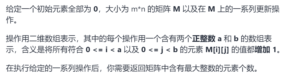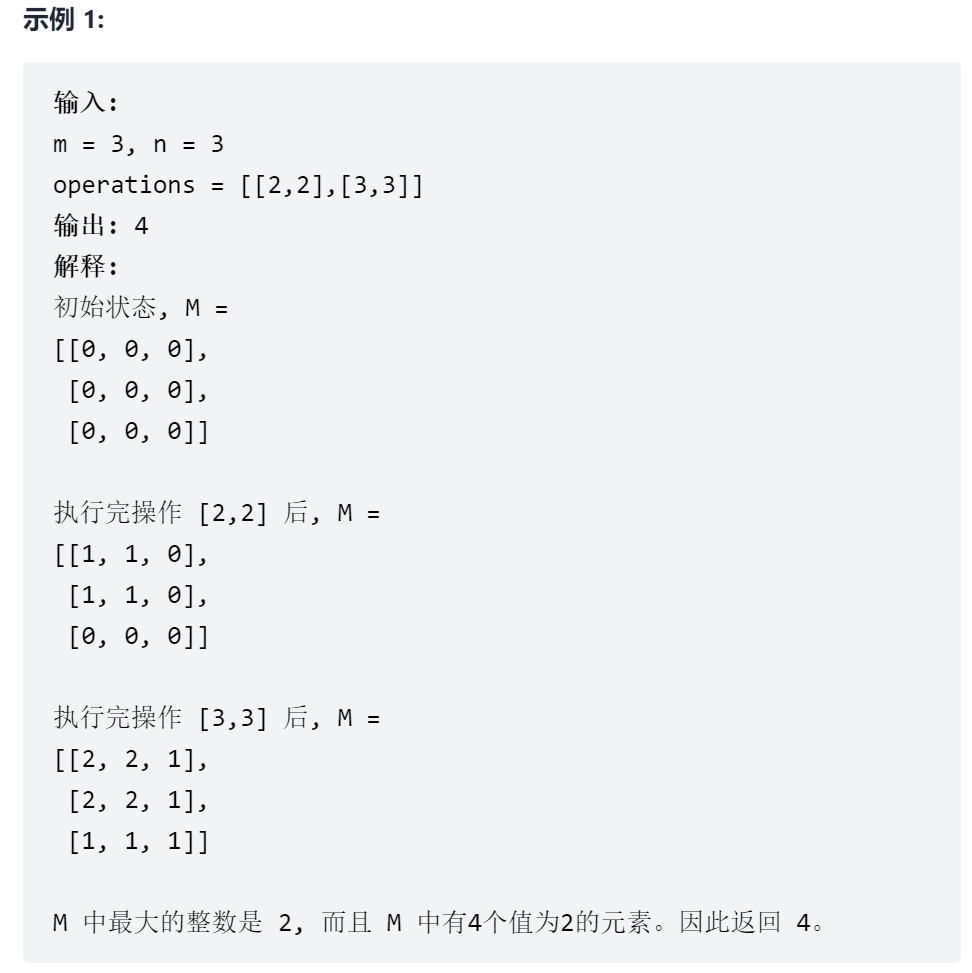 题目要求统计操作结束后,矩阵中有多少个最大元素。这里会发现——不管操作是什么,(0,0)这个点是一直被包括的。因此(0,0)一定是一个最大值,那么题目就变成了最后有几个跟(0,0)位置相等的元素。