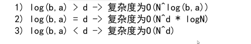 其中,T(N)表示 母问题的数据量(规模)是N级别 T(N/b)表示 子问题的规模 a表示 调用子问题的次数 O(N^d)表示 剩余语句的时间复杂度