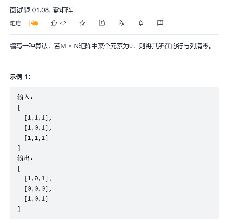 那么我们就需要想一种对自身进行操作的方法,不需要辅助矩阵。我们可以使用第一行和第一列来记录是否存在0点。但是问题就是:如果第一行和第一列也存在0点,这样记录会被覆盖。因此我们需要用两个boolean变量来记录第一行和第一列是否存在零点,最后记录完成后再进行改造,改造的具体方法是:行和列分别从1开始遍历(因为第一行和第一列单独处理),如果对应的第一列或第一行为0,那么就清空对应对应行/列,注意行和列的清空是相反的。