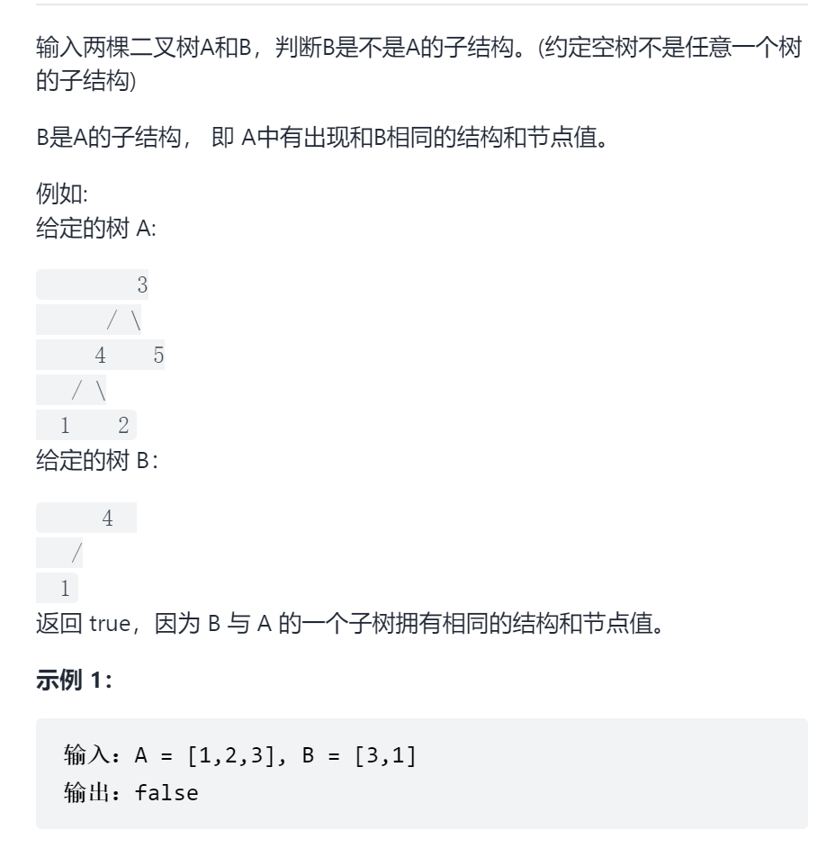 public boolean check(TreeNode A, TreeNode B){ //基本情况 if(B==null){ return true;//B的结构为空,不影响结果,返回true } if(A==null||A.val!=B.val){ return false; //A是空或值不同,不是子树 } //特殊情况,递归,查看左子树和右子树是否构成子结构 return check(A.left,B.left)&&check(A.right,B.right); }