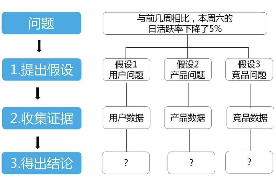假设2产品问题:例如,服务器是不是崩溃了?最近是否上线了产品新版本,其中新功能有问题?或者是没有处理产品版本问题导致?甚至可以去问客服,最近是不是有大量投诉,投诉原因是什么?还可以查看用户对产品满意度方面的数据。结论:产品没有问题。
