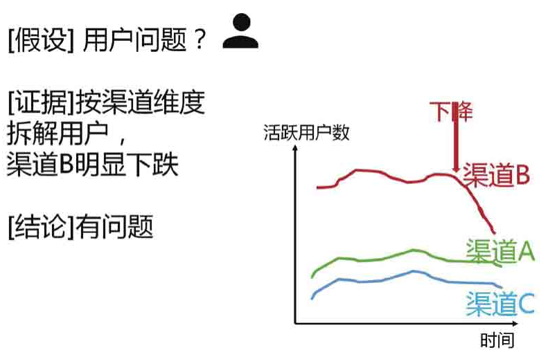 假设1用户问题:找到对应的用户数据。将活跃用户数按渠道维度拆解。发现来自渠道B的活跃用户数出现了明显的下跌。