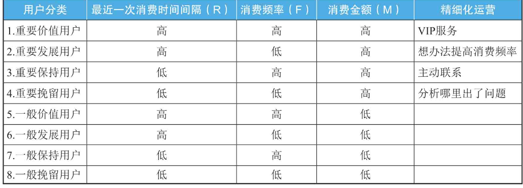 RFM分析方法把用户分为8类,对不同价值的用户使用不同的运营决策,把公司有限的资源发挥到最大的效果。