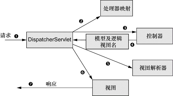 一旦选择了合适的控制器,DispatcherServlet会将请求发送给选中的控制器 3️⃣。到了控制器,请求会卸下其负载(用户提交的信息)并耐心等待控制器处理这些信息。实际上,设计良好的控制器本身只处理很少甚至不处理工作,而是将业务逻辑委托给一个或多个服务对象进行处理。