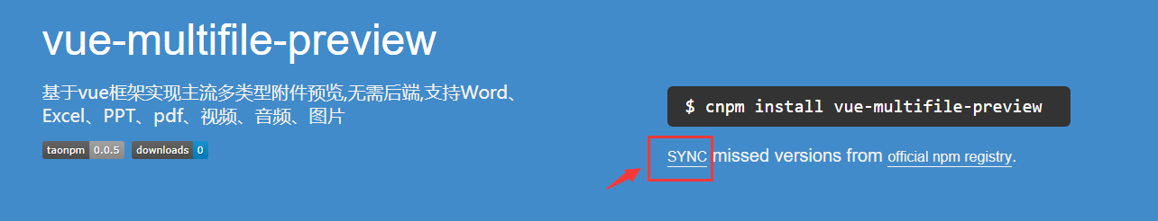 打开淘宝 NPM 镜像,将组件名vue-multifile-preview输入进行搜索 点击下图所示进行同步