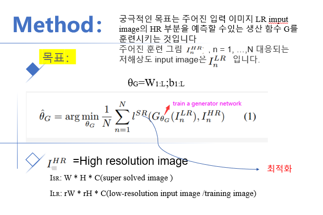 이미지 초 고해상도를 이러한 프로세스로 간주합니다. Generator network을 통해서 고해상도 이미지가 생성되어 판별기(discriminator)를 구별하기 어렵습니다.