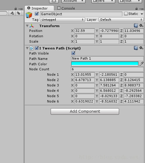 下载完成并导入后,在场景中创建一个空对象,给对象添加iTweenPath组件
