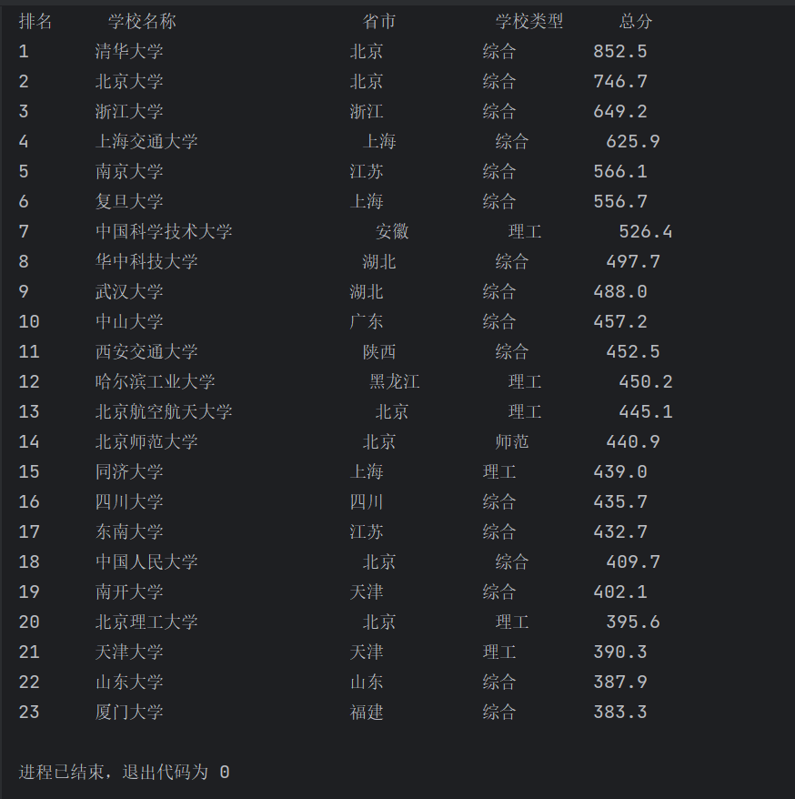 print("{:<6} {:<20} {:<10} {:<8} {:<10}".format(rank, school_name, province_city, school_type, total_score))