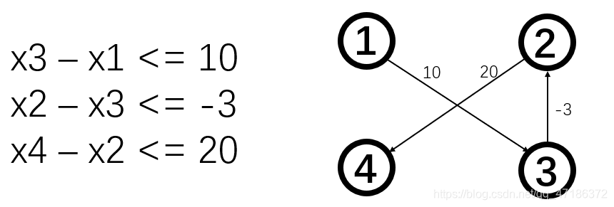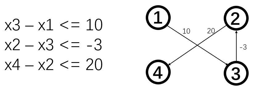 \(x_i\) - \(x_j\) <= k(i,j∈[1,n]),则成为差分约束系统。