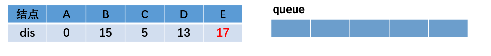 ②与A相邻的结点有B、C,我们按算法的思想将dis与queue更新得: