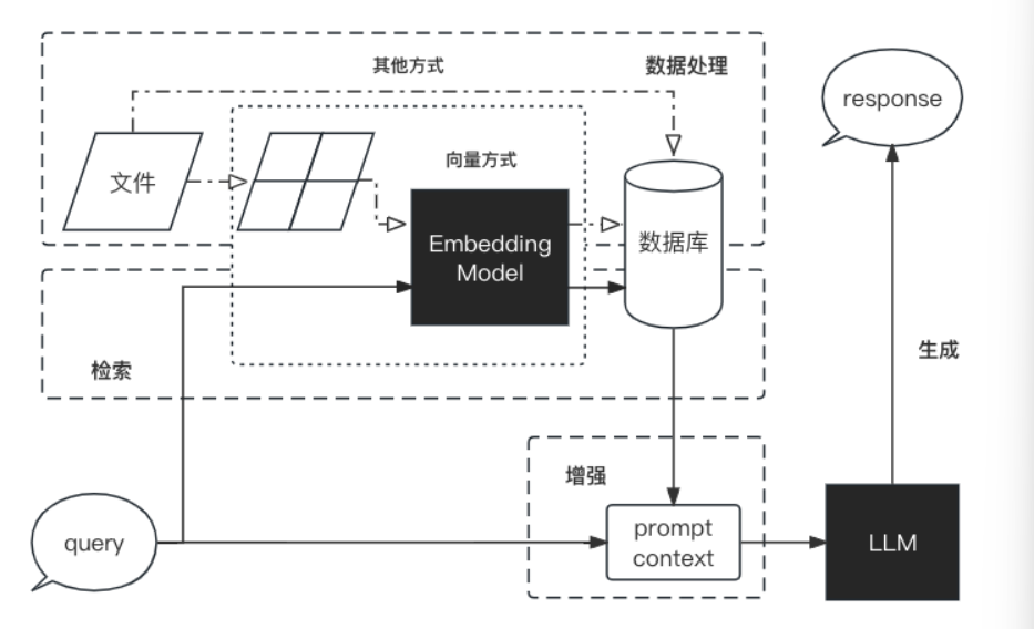 文本处理、向量检索、数据增强、数据生成。将文本载入后分块,使用词嵌入模型将其向量化,存入向量数据库,解析用户问题,使用相同的词嵌入模型向量化,检索相似的知识库文本,叠加prompt带入LLM,生成answer