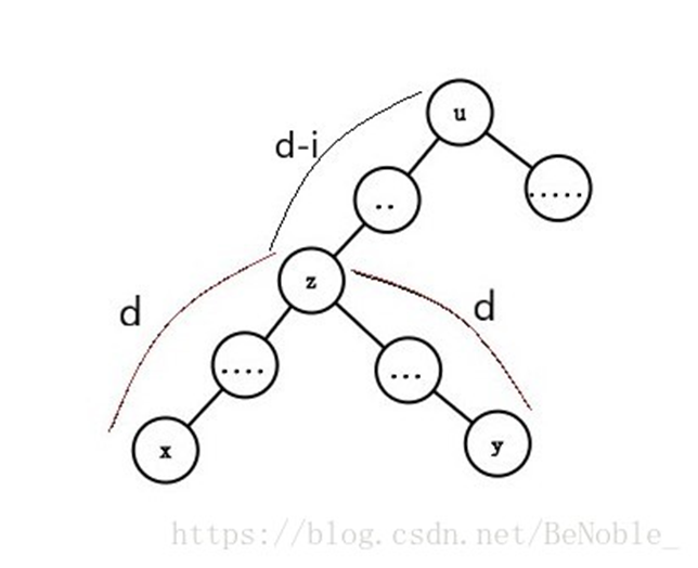 为了维护第二种情况,设 \(g_{u,i}\) 表示节点 \(u\) 的子树内两个点 \(x,y\) 到 LCA 的距离为 \(d\),LCA 到 \(u\) 的距离为 \(d-i\)