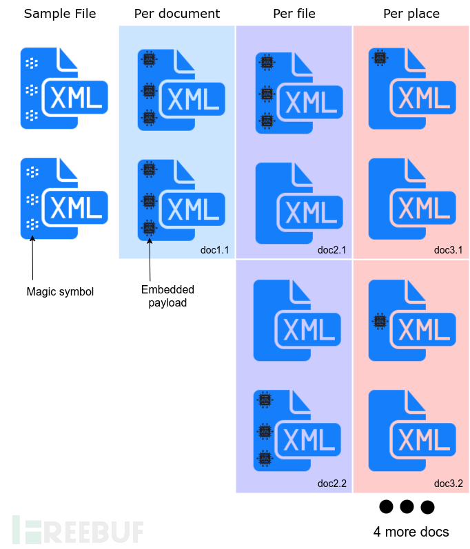 per_file - 对于各个payload,文档中的各个文件,以及文件中的所有位置嵌入payload并创建新文档