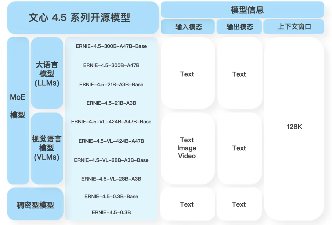 6 月 30 日,百度正式开源文心大模型 4.5 系列模型,涵盖 47B、3B 激活参数的混合专家(MoE)模型,与 0.3B 参数的稠密型模型等 10 款模型,并实现预训练权重和推理代码的完全开源。目前,文心大模型 4.5 开源系列可在飞桨星河社区、HuggingFace 等平台下载部署使用,同时开源模型 API 服务也可在百度智能云千帆大模型平台使用。