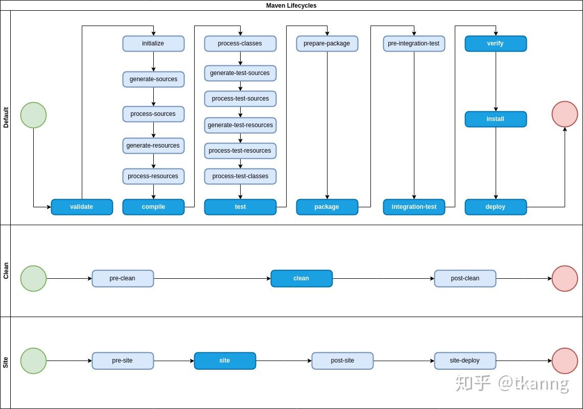 Maven 有三套独立的 Lifecycle:default、clean 和 site,每个 Lifecycle 包含多个 Phase。下图详细的展示了Lifecycle 和 Phase的关系。