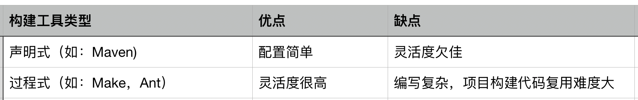 相对应地,Make 和 Ant 等构建工具是过程式项目管理工具,用户需要编写构建脚本并组织各脚本的依赖关系。过程式项目管理工具好处是,用户自由度很大;坏处是,项目管理经验无法复用,构建脚本编写较为复杂。