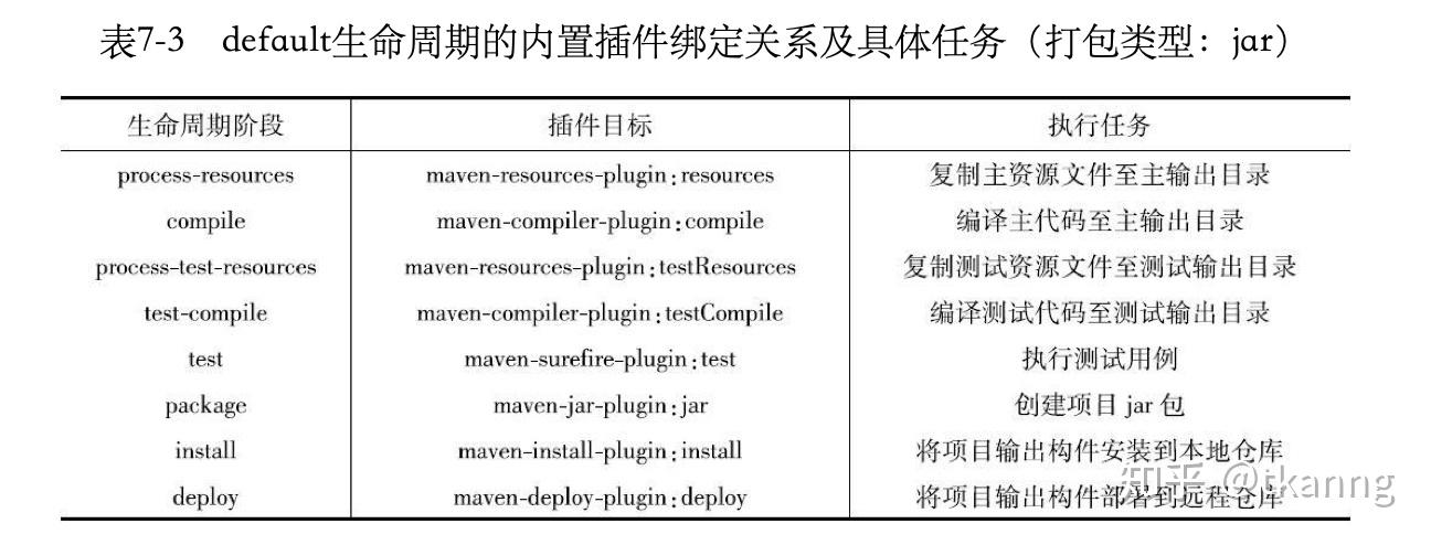 一个 Plugin 包含多个goal,来完成项目构建的实际工作,如:Compiler plugin 有两个goal compile 和 testCompile,分别用于编译main代码与编译test代码。下图是default生命周期的插件内置绑定与具体goal的绑定关系: