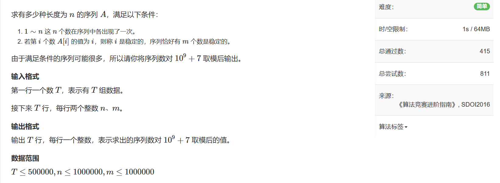 printf("%lld\n", ((s[n] * inv[n - m]) % MOD * inv[m] % MOD) * f[n - m] % MOD);