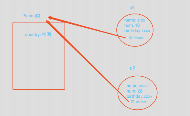 class Person: # 类变量, 表示所有的该类的对象都共享这个变量. country = "中国" def __init__(self, name, num, birthday): # 实例变量(字段) 表示你创建的每⼀个⼈都有这三个变量 self.name = name self.num = num self.birthday = birthday p1 = Person("alex", 18, "1840年06⽉01⽇") print(p1.name) # alex print(p1.country) #中国 p2 = Person("wusir", 28, "1894年07⽉25⽇") print(p2.name) # wusir print(p2.country) # 中国