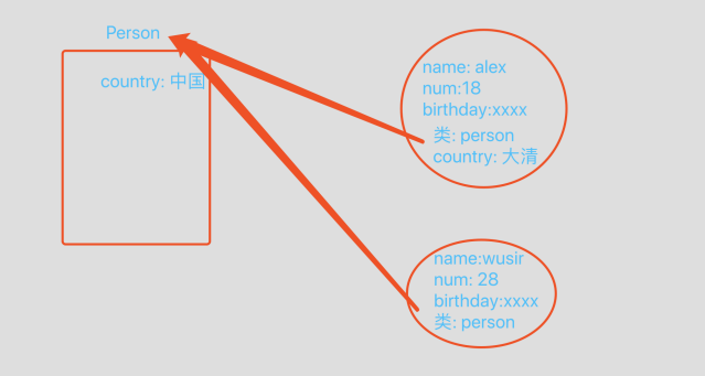 Person.country = "⼤清" # 在这⾥. 我把国家改成了⼤清 p1 = Person("alex", 18, "1840年06⽉01⽇") print(p1.name) print(p1.country) # alex是⼤清的 p2 = Person("wusir", 28, "1894年07⽉25⽇") print(p2.name) print(p2.country) # wusir也是⼤清的