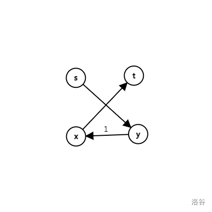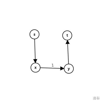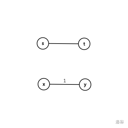 比如这个图,我们要使\(s \to t\)的距离变短,就得加一条边权为1的边\(x \to y\)。