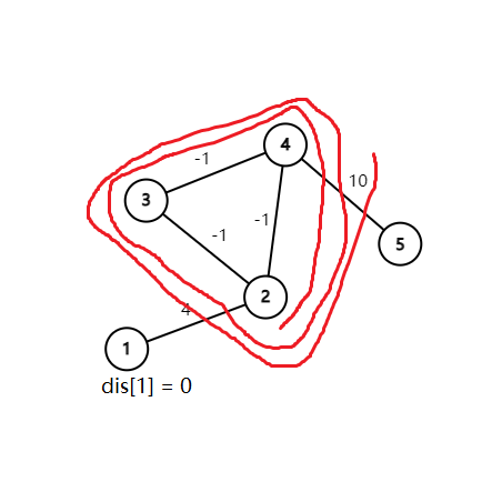 因为2、3、4点每次松弛之后,他还有更小的、可以松弛到的最短路,所以我们定义:带有负环的图没有最短路(只有更短路)。