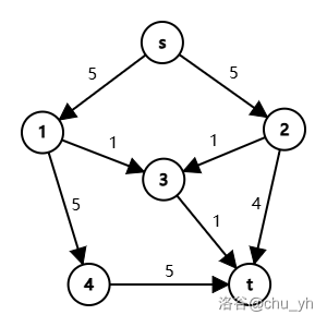 若程序找到了 \(s \to 1 \to 3 \to t\) 这条贡献仅为 \(1\) 增广路径,那么最终算出的最大流就只有 \(9\)。但容易发现,选择 \(s \to 1\to 4 \to t\)、\(s \to 2 \to t\) 和 \(s \to 2 \to 3 \to t\) 可以算出最大流为 \(10\)。
