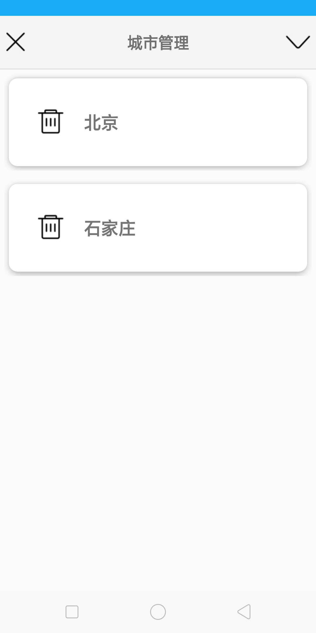 继上次第一阶段检测后,我们又完成了新的功能,虽然花了较多时间,但好歹最后还是完成了,我们的天气预报系统成功添加了删除功能,可以把自己不想要的城市删除掉。下面是删除界面