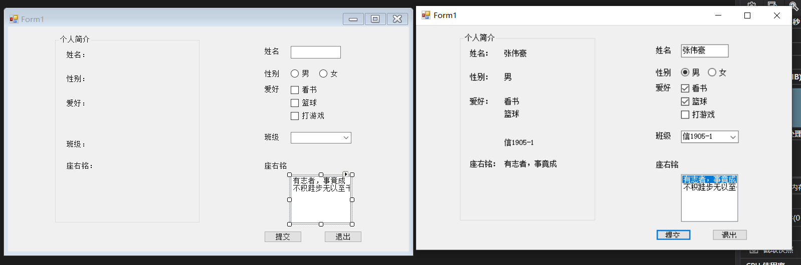 今天完成了一个.net的实验,老师让我们用TextBox、GroupBox、RadioButton、CheckBox、ComboBox、ListBox 控件这些控件编写一个Windows应用程序,所以我写了一个简单的个人简介生成软件。